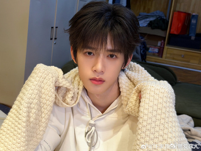 画面里的他,身着一件简约的白色连帽衫,干净纯粹得如同冬日里的初雪。连帽衫上那根灰色抽绳随意地垂在胸前,增添了几分随性与自在。他披着一件粗针织的米白色毛衣,宽大的毛衣裹在身上,更衬出他的身形单薄却挺拔。毛衣的纹理清晰可见,每一针每一线都仿佛编织着青春的温暖与美好。