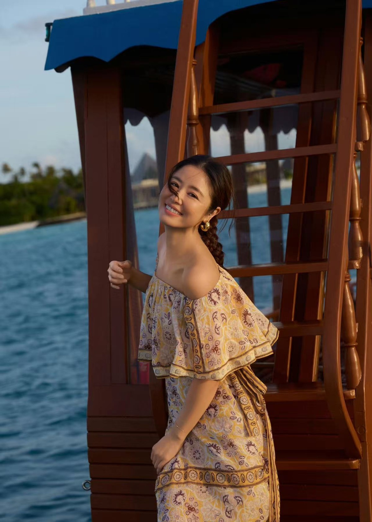 这套海边造型氛围感拉满,林心如上身一件黄棕调异域风露肩长裙,一字肩设计可以完美展露肩颈线条,衬得天鹅颈修长优雅,弱化了年龄感,还可以尽显女性柔美。裙身的复古印花则自带浓郁的异域风情,暖黄底色温柔显白,搭配多层复古纹样镶边,层次感拉满,高级感十足。