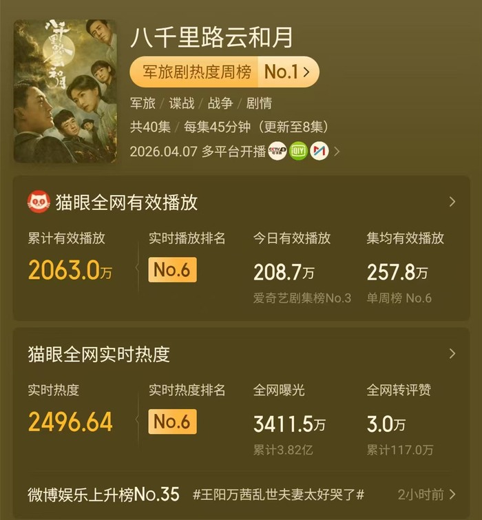 截至目前,电视剧《八千里路云和月》的累计有效播放数字是2063.0万,集均是257.8万。面对这样的累计有效播放数字和集均数字,我们就不要拿播放数字高的电视剧进行对比了,我们只拿一部被观众们广泛批评为扑街的《冰湖重生》进行对比吧。对比之前,明确一点,《冰湖重生》比《八千里路云和月》还要晚一天上线,截至目前,该剧的集均已经实现251.2万。一部所谓的大剧,眼看着连《冰湖重生》这类烂俗戏都“打不过”了,真的不应该。
