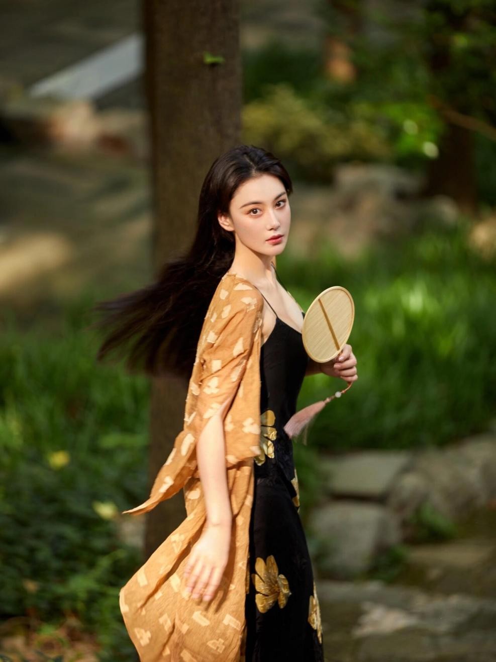 连衣裙是细肩带,把肩颈线条衬得格外舒展。裙子的面料自带垂坠感,贴身穿特别显身材,把腰臀线条勾勒得刚刚好。裙身印着大面积的金色图案,还搭配了暗纹的黑色花叶做点缀,黑金撞色贵气感拉满。开衫十分的宽松,随意披在身上就很有松弛感,给整体造型增加层次感。