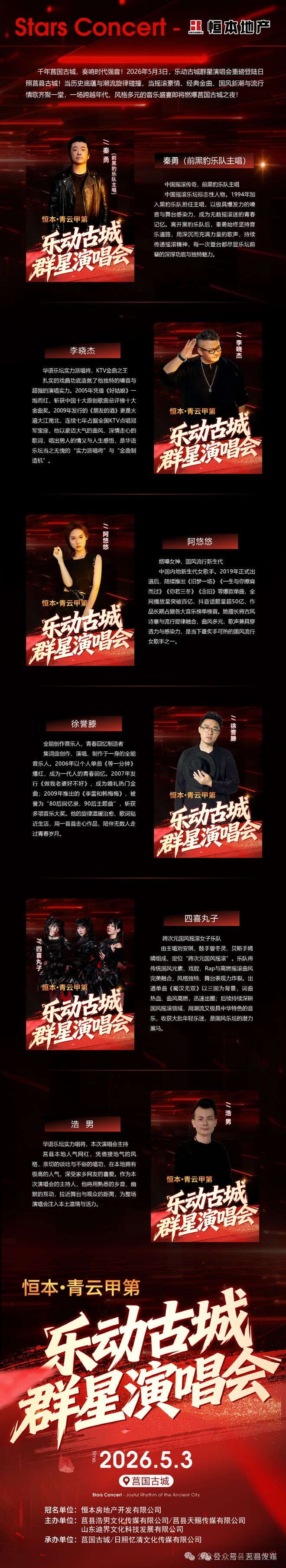 本次演唱会阵容覆盖多元音乐风格,将摇滚力量、流行热歌与国民金曲一网打尽。前黑豹乐队主唱秦勇,将带来《Don't break my heart》《无地自容》《一起长大》等经典摇滚代表作,用充满力量的歌声唤醒一代人的青春热血;华语乐坛实力派唱将李晓杰,凭借《朋友的酒》《把酒倒满》《好姑娘》等国民金曲火遍大江南北,将以豪迈大气的曲风唱响男人情义与人生感悟;烟嗓女神、国风流行新生代阿悠悠,将唱响《旧梦一场》《你若三冬》《一生与你擦肩而过》等爆款热单,用兼具穿透力与感染力的歌声点燃现场氛围;全能创作音乐人徐誉滕,以《等一分钟》《天使的翅膀》《做我老婆好不好》等金曲成为一代人的青春记忆,将用温暖治愈的旋律勾起无数人的青春回忆;跨次元国风摇滚女子乐队四喜丸子,将带来《PA PA LAND》《蜀汉无双》《魏武独尊》等代表作,融合传统国风元素与高燃摇滚曲风,展现国风音乐的全新活力;华语乐坛实力唱将、本次演唱会主持人浩男,也将登台献唱《太想念》等热门曲目,用极具本土特色的风格为现场注入温情与活力。从经典摇滚到国民金曲,从抖音爆款到国风新潮,多元曲目覆盖不同年龄段乐迷的听歌需求,现场将打造全场大合唱的沉浸式氛围。