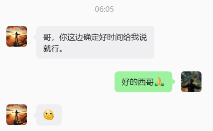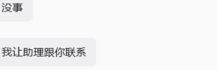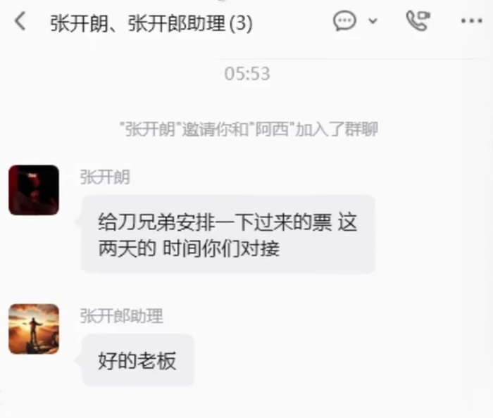 之后,洋三刀又晒出与张开朗助理的聊天记录。助理询问洋三刀:“哥,您从哪儿出发,计划何时动身,方便告知以便安排订票。”