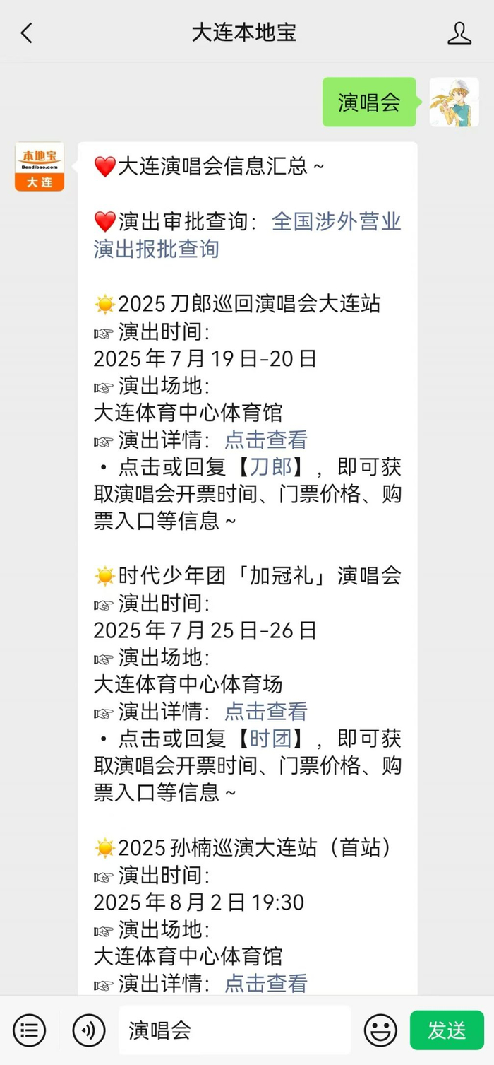 温馨提示:微信搜索公众号【大连本地宝】,关注后在对话框回复【演唱会】可获2025大连演唱会最新消息,演唱会演出时间/场馆/票价、官方购票入口、开票时间等信息~