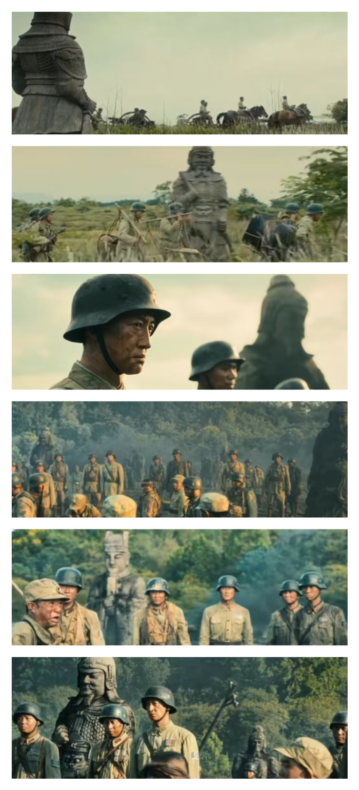 贯穿全剧的石像生,是极具东方美学的核心意象。《八千里路云和月》中,石像生的出现极具冲击力。这些本应静卧陵寝、象征文明秩序的石刻,被置于战壕与荒野,断首裂身却依旧伫立。在抗战时期,许多历史文化遗迹确实直接沦为了战场,或者遭到了严重破坏。剧中的处理,是将这种文化劫难,进行了一次高度凝练的视觉化表达。镜头下,代表五千年文明的石像与血肉横飞的战场并置,无声地完成了“文明”与“野蛮”的对峙。