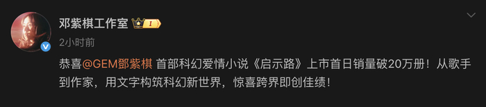 7月10日,华语歌手邓紫棋在社交媒体发文称,她写的首部长篇科幻小说《启示路》正式开启预售。11日,邓紫棋工作室公布预售数据,该小说上市首日销量破20万册。