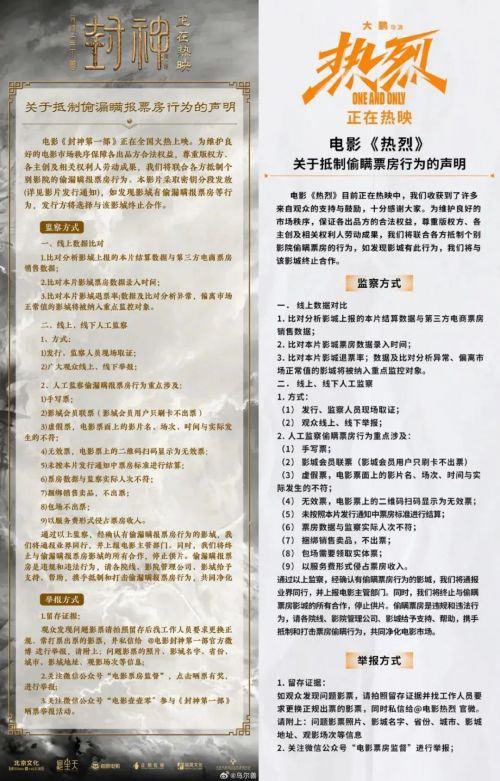 8月1日晚,电影《封神第一部》的导演乌尔善在网上发布了《关于抵制偷漏瞒报票房行为的声明》,随后电影《热烈》片方也发布了相关声明。