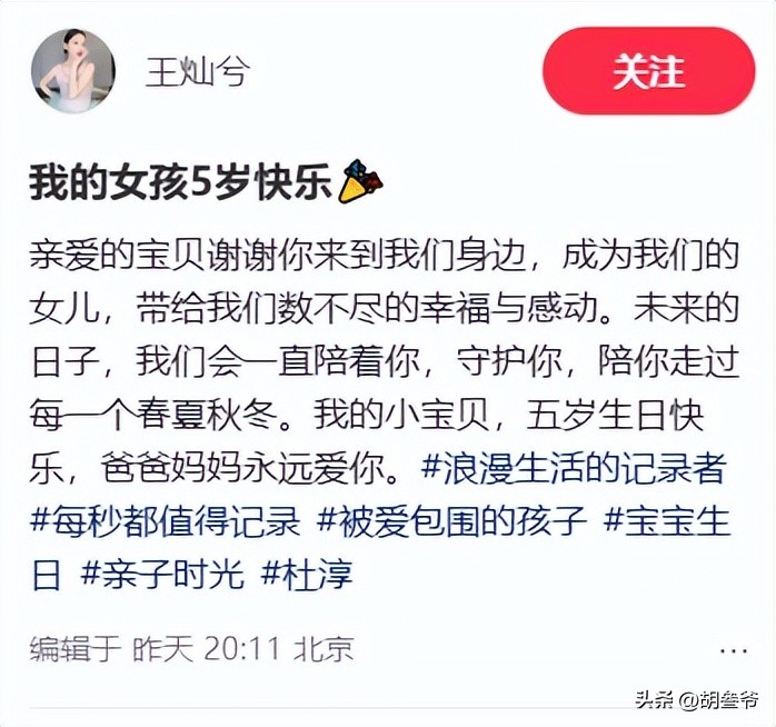 4月12日零点刚过,王灿就在短视频平台同步更新了为女儿小蛋饺庆生的视频与合照。