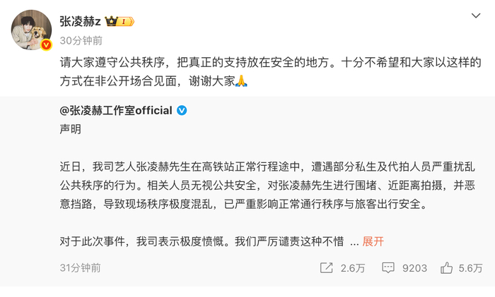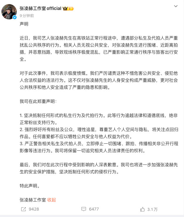 近日,我司艺人张凌赫先生在高铁站正常行程途中,遭遇部分私生及代拍人员严重扰乱公共秩序的行为。相关人员无视公共安全,对张凌赫先生进行围堵、近距离拍摄,并恶意挡路,导致现场秩序极度混乱,已严重影响正常通行秩序与旅客出行安全。