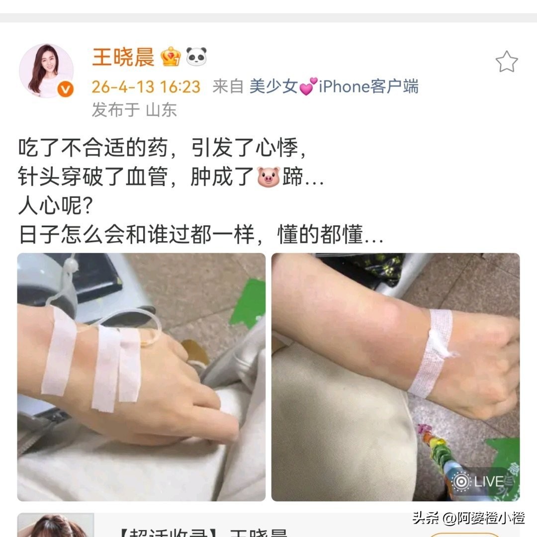 4月13日下午,37岁的演员王晓晨在社交平台晒出一张输液照片,手背肿得像馒头,自述误食药物引发心悸,就医时被扎破血管。