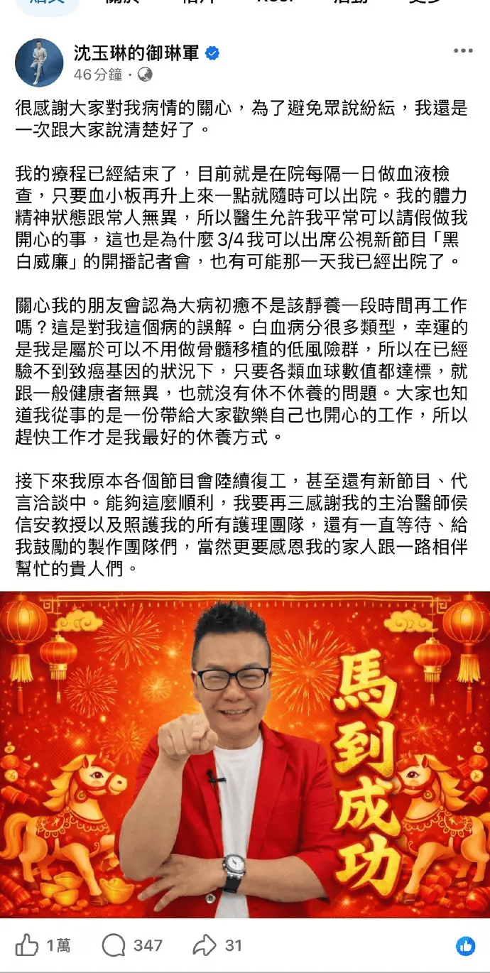 搜狐娱乐讯 2月27日,沈玉琳发文谈病况。他表示自己的白血病是不用做骨髓移植的低风险群,经医生评估现在的体力和常人无异,医生也允许他平常可以请假做自己开心的事,而自己从事的是一份带给大家欢乐自己也开心的工作 。