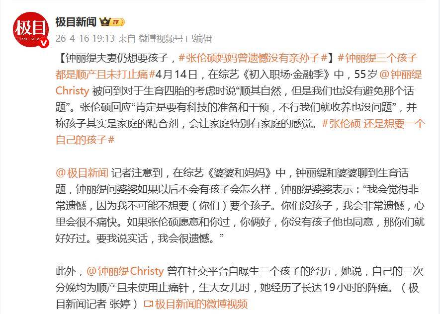 这番关于生育的讨论,再次将这对明星夫妻的家庭议题推至公众面前。事实上,关于孩子的话题,始终是他们家庭互动中的一个焦点。在另一档综艺《婆婆和妈妈》中,钟丽缇曾直接询问婆婆,如果自己未来没有孩子会怎样。钟丽缇的婆婆、张伦硕的母亲当时给出了非常直白的回答:“我会觉得非常遗憾,因为我不可能不想要(你们)要个孩子。你们没孩子,我会非常遗憾,心里会很不痛快。”她随后也表示,如果儿子同意,夫妻俩感情好,那也可以好好过,但自己“说实话,会很遗憾”。