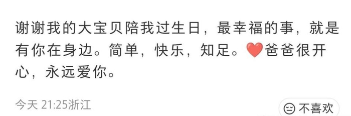 贾乃亮在配文中写道:“谢谢我的大宝贝陪我过生日,最幸福的事就是有你在身边。 简单,快乐,知足。 爸爸很开心,永远爱你。 ”这段文字延续了他多年来的习惯,一直用“大宝贝”称呼女儿。 甜馨随后在社交平台发布视频回应“永远爱你”,还罕见地晒出了童年全家福旧照片,照片里除了爸爸,妈妈李小璐也在。