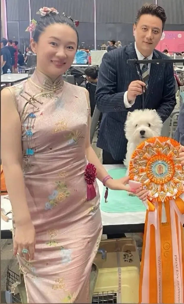 比赛当天,冠军犬主特意要求和霍思燕一家合影了,霍思燕穿着浅粉色旗袍、盘着头发,她素颜的模样很真实。