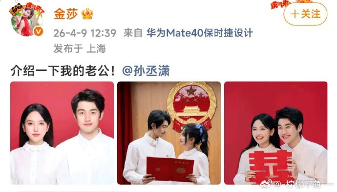 2026年2月13日,金莎与孙丞潇于北京海淀区民政局登记结婚,并于4月9日通过微博晒出结婚照正式官宣。两人以“介绍一下我的老公/老婆”互称,同步官宣合体综艺《妻子的浪漫旅行2026》,呈现婚后日常。这一节点标志着历时近四年的恋情修成正果,婚姻进入法律与社会双重认可的新阶段。
