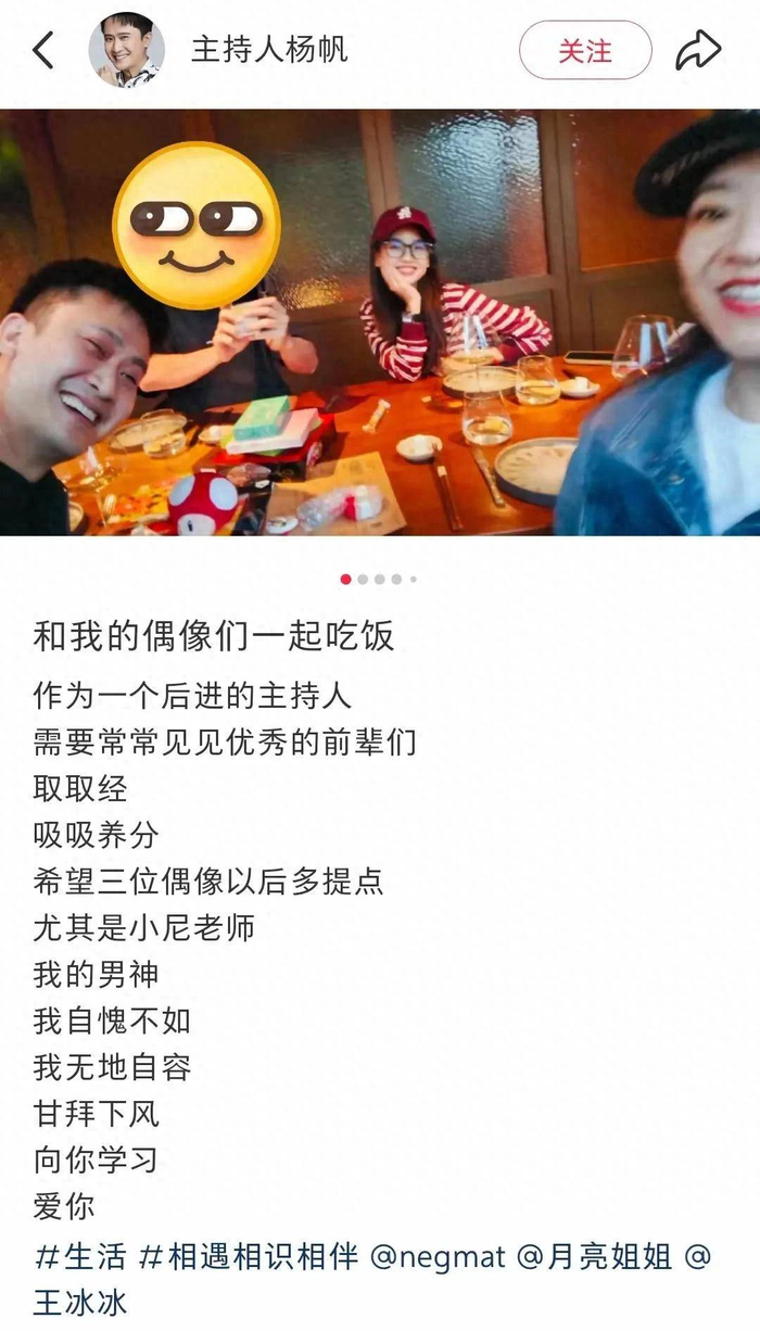不仅如此,杨帆还在配文中毫不吝啬地对尼格买提表达了赞美:“尼可买提是他的男神,自愧不如,无地自容,甘拜下风,想向你学习,爱你。”