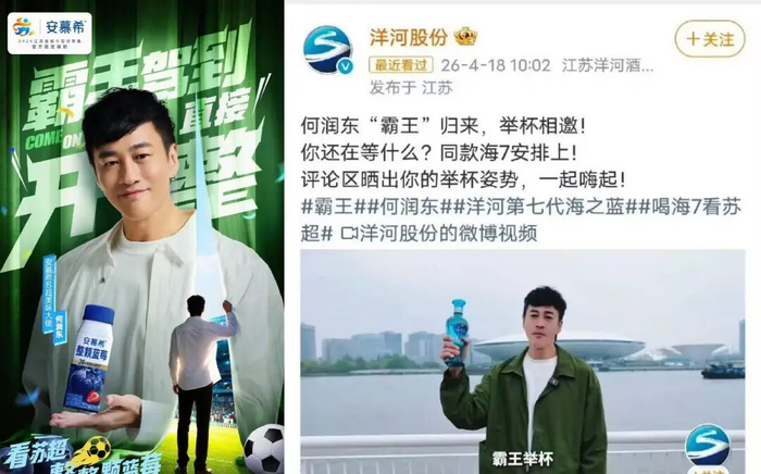 而助阵苏超只是何润东近期密集涌入的活动之一,在4月爆红以后,已经许久没有作品上映的何润东意外迎来了自己的“流量巅峰”。蓝鲸新闻记者统计,近半个月内何润东已经接到安慕希、洋河股份、支付宝、京东、王者荣耀等多个广告商务活动,覆盖了消费品、互联网平台,着实算得上流量事业双丰收。