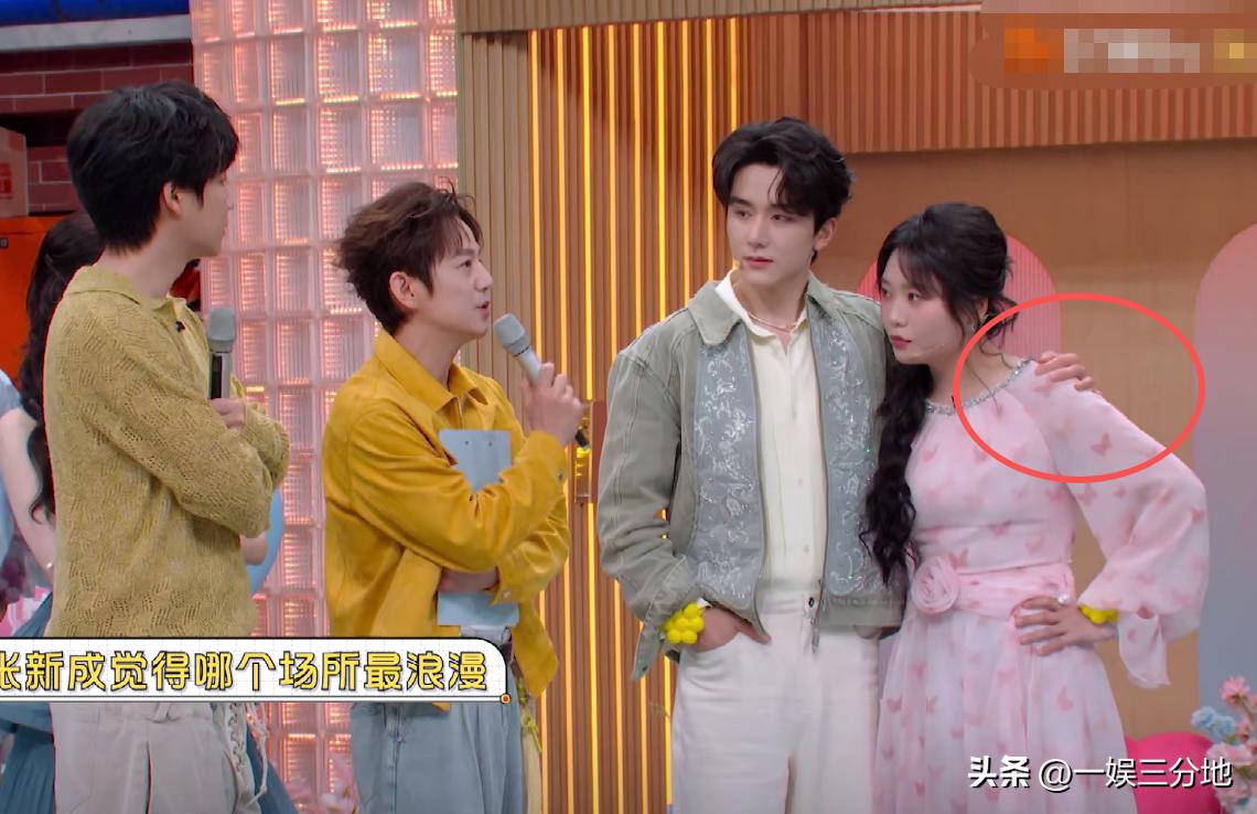 景甜只有一只手抓着张新成肩膀,上半身却后仰,感觉和男生拉出了距离,就是在完成任务。
