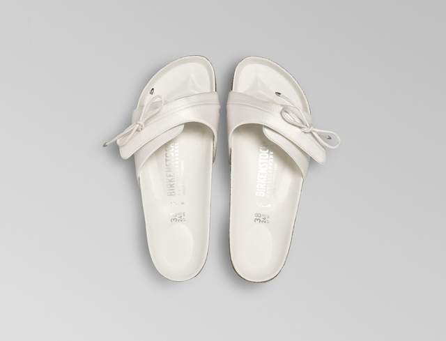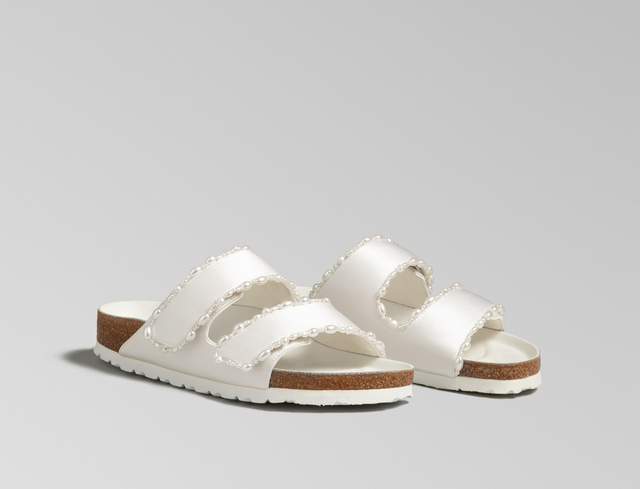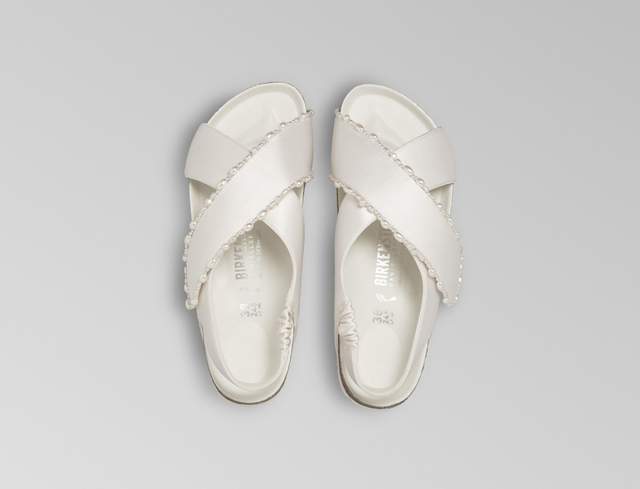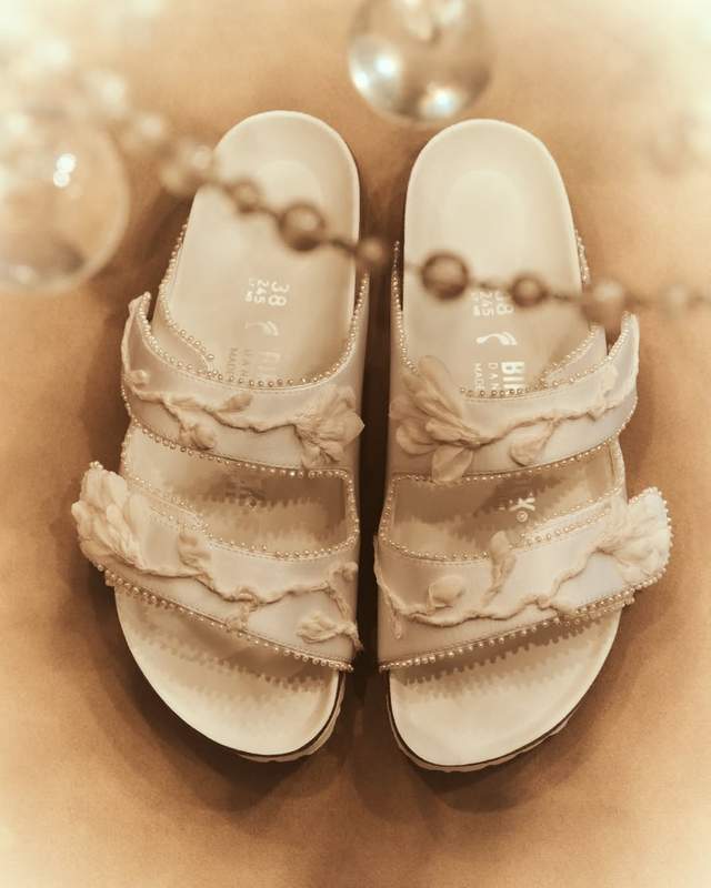 Birkenstock 经典的 Arizona 鞋款换上象牙白丝绮材质,上头还有细致珍珠滚边以及雪纺刺绣花卉点缀; 另一双以 Boston 鞋款为核心,搭配象牙色皮革,鞋面饰以订制手绘花卉图案,都让原先休闲轻便的鞋款变得好梦幻浪漫。