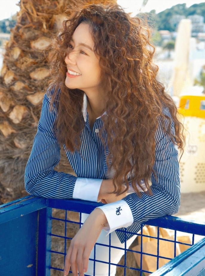 女神留着一头蓬松慵懒的羊毛卷长发,发量看起来特别多,让人甚是羡慕。头发的卷度自然又随性,发丝随意散在肩头,带着点漫不经心的松弛感,完全掌握了法式慵懒风的精髓。说完发型,再来看看衣服,上身穿了一件融入蓝白细条纹的衬衫,经典的竖条纹版型特别显利落。领口设计十分抢眼,是撞色的白色翻领设计,层次鲜明。我们在衬衫的袖口可以看到一圈白边,细节感直接拉满,不会让基础款显得单调。