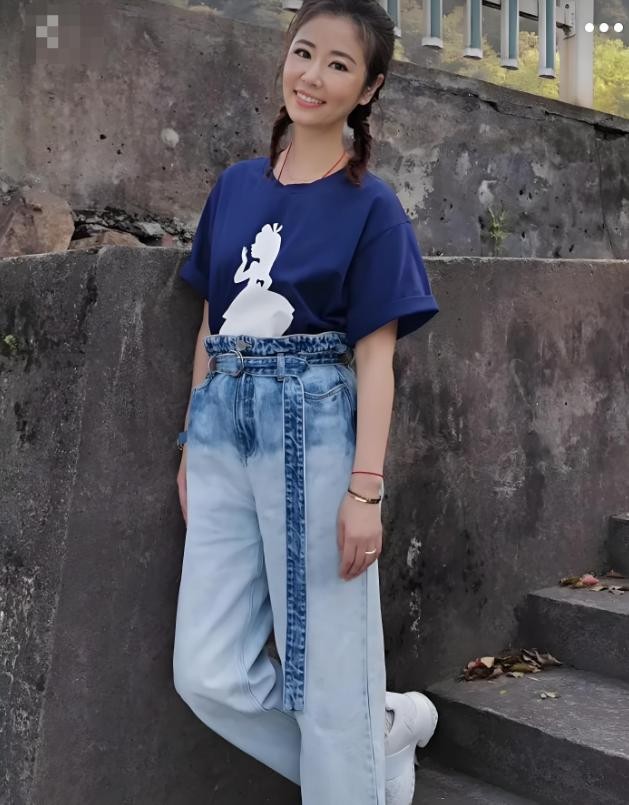 蓝色短袖在人群中很吸睛,圆领的设计简约又大方,衣身正面印着一个白色的卡通图案,给基础款T恤添了不少活泼感,避免了枯燥乏味。T恤衣摆塞进了裤腰,所以衣长是多少没有办法确定。头发编成了两条俏皮的麻花辫,发尾松松垮垮垂在肩头,额前留了点碎发修饰脸型,整个人看着减龄又元气,完全看不出年龄感。