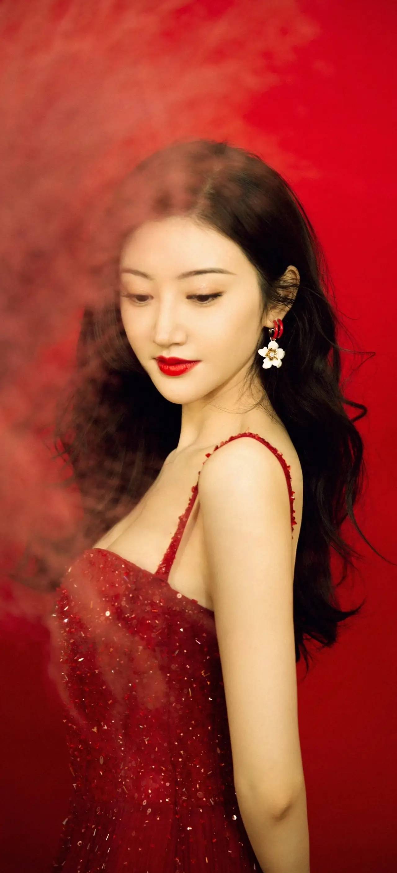 景甜穿着玫瑰红颜色的抹胸长裙,她侧身回眸很明艳动人,露出傲人的事业线,大秀玲珑的魔鬼身材,绝对性感火辣!