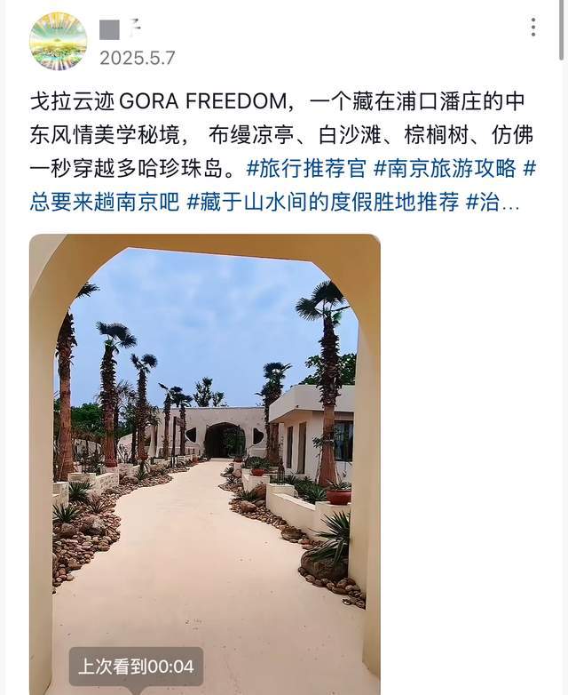 据知情人士透露,地点名叫“戈拉云迹”,一个藏在浦口潘庄的中东风情美学秘境,里面有布幔凉亭,棕榈树,仿佛多哈珍珠岛。