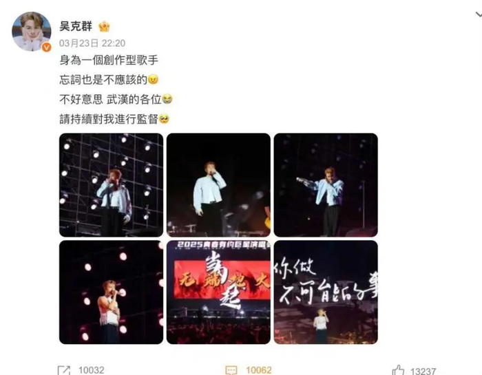 吴克群在个人微博写道:“身为一个创作型歌手,忘词也是不应该的,不好意思武汉的各位,请持续对我进行监督。”