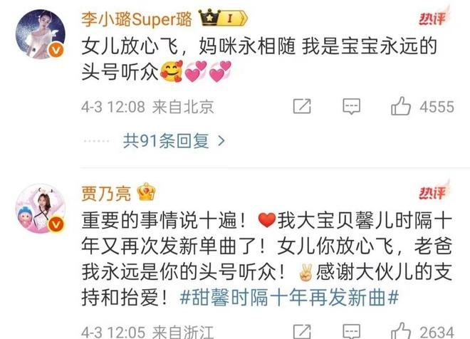 近期有传言说甜馨签约公司准备进入歌坛发展,还发表了新歌,李小璐和贾乃亮纷纷前来给女儿打Call。