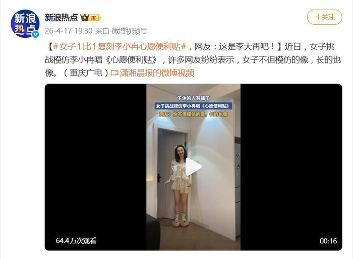 据4月17日报道,最近,一段模仿视频在网络上火了,火得连正主看了可能都得愣一下。一位重庆女子对李小冉在《乘风2026》中的《心愿便利贴》舞台进行了“像素级”复刻,从跑调唱腔到呆萌表情,模仿得形神兼备,被网友欢乐送上外号“李大再”。