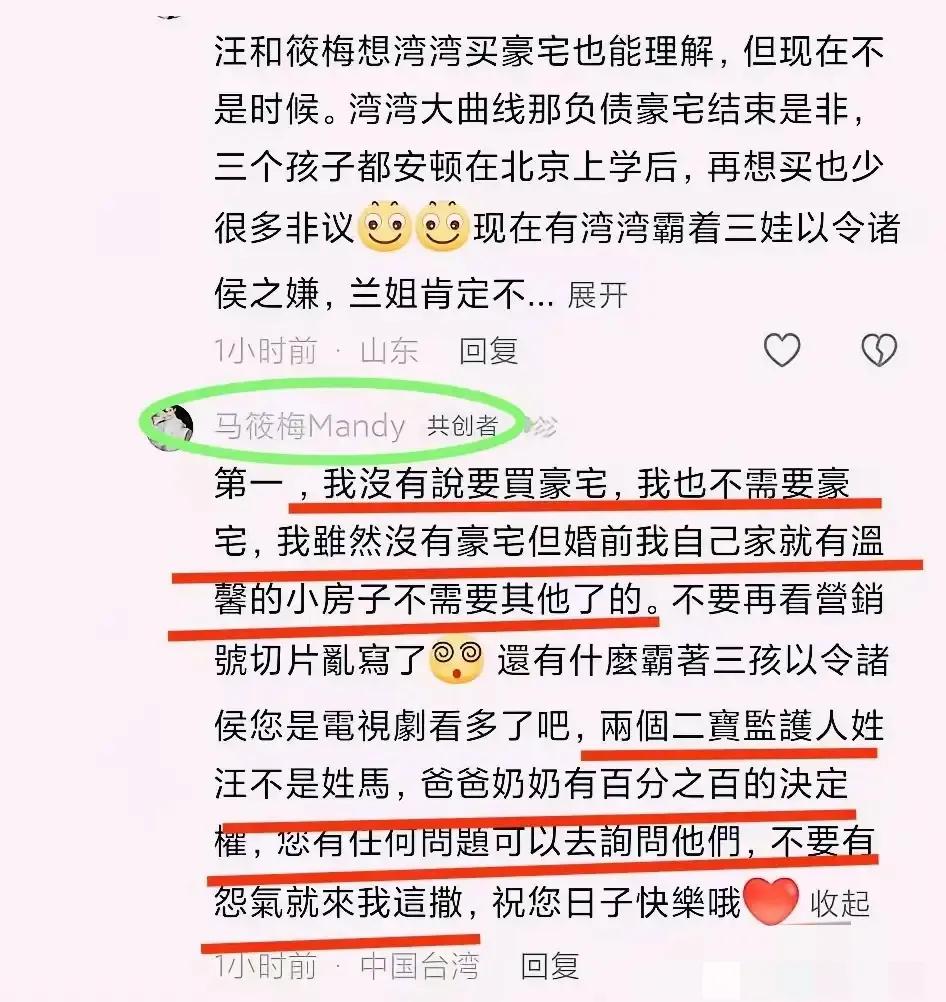 并且马筱梅在回复网友时,专门发布了一大篇文字,直言“两个孩子姓汪不姓马”,对于两个孩子的事情爸爸和奶奶都拥有决定权,请不要什么事情都按在自己身上,完全就是一副“事不关己”的姿态。