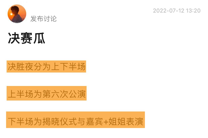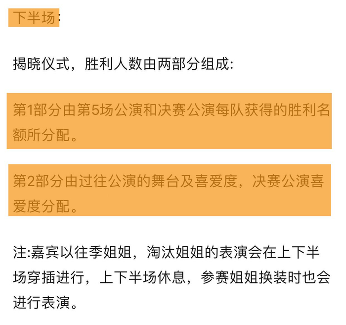 《浪姐3》总决赛分为上下半场,上半场为第六次公演,下半场为揭晓仪式与表演,其中包括表演嘉宾和姐姐们的舞台表演。