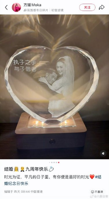 方媛同步配文“平凡日子里有你便是最好的时光”,与澄清形成呼应。她通过定义礼物的情感属性(而非价格标签),消解公众对明星应赠奢侈品的刻板期待。商家透露设计师曾为婚纱照补绘头纱细节,印证定制过程的用心,方媛借此传递“心意无价”的婚姻观,引导舆论聚焦情感价值。