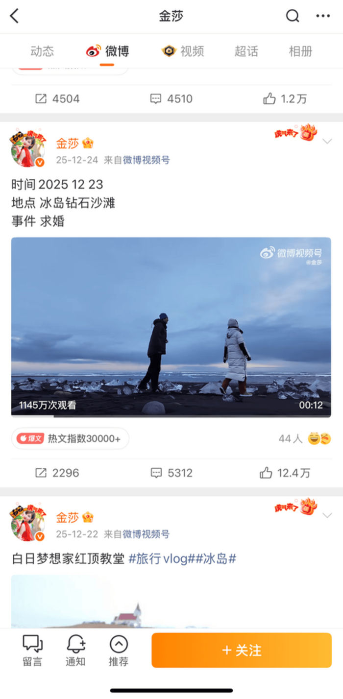 4月7日中午,金莎在微博晒出两人节目海报,并写下:“突然想起,上回在冰岛的钻石沙滩上你红红的眼睛、赤诚的眼神……”孙丞潇则写下:“落雪映佳人,眉目皆温柔,愿与你共至白头,只剩浪漫。”答案似乎已呼之欲出,有网友就留言表示:“期待你们的浪漫旅行”。