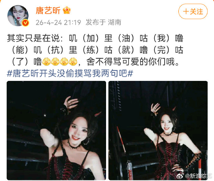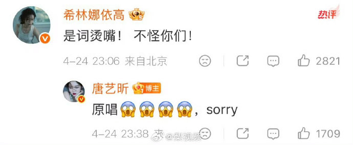 真正的转机来自原唱希林娜依高的“神助攻”。她第一时间现身评论区,用一句“是词烫嘴!不怪你们!”四两拨千斤:既将问题归因于歌词难度而非演唱者能力,又以“你们”二字涵盖整个团队,避免责任指向个人。唐艺昕随即俏皮回应:“原唱!Sorry!”,两人一来一往的互动被赞“可爱又大气”,争议就此冰消瓦解。