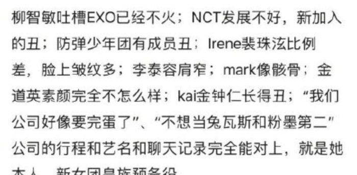 组合的队长柳智敏,艺名Karina,出道被爆诋毁同公司前辈,直呼公司要倒闭了。