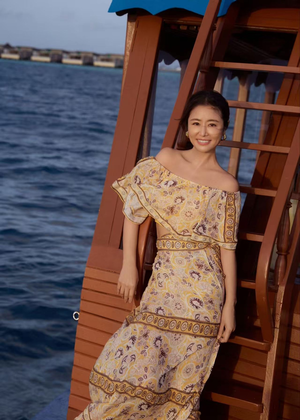 这套海边造型氛围感拉满,林心如上身一件黄棕调异域风露肩长裙,一字肩设计可以完美展露肩颈线条,衬得天鹅颈修长优雅,弱化了年龄感,还可以尽显女性柔美。裙身的复古印花则自带浓郁的异域风情,暖黄底色温柔显白,搭配多层复古纹样镶边,层次感拉满,高级感十足。