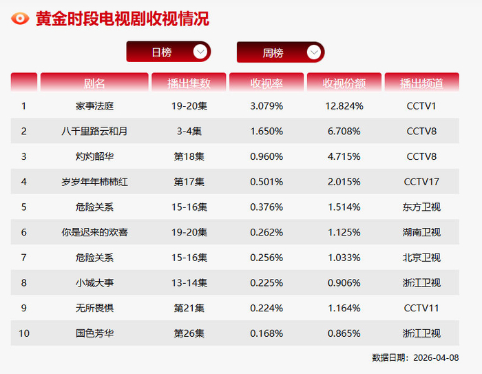 4月10日,电视剧《八千里路云和月》播出至第8集。该剧目前形成的收视率、网播数字和观众口碑情况,可以做一次纵览了。收视率方面,CVB上,该剧首播收视相对一般,次日下滑严重。网络播放数字方面,该剧目前集均刚刚过250万。观众口碑方面,该剧在豆瓣短评区域,已经出现了连成一片的差评。