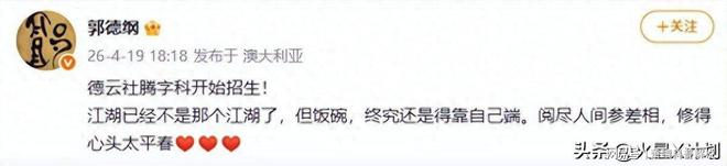 郭德纲在2026年4月19日晚上发了一条微博,就两句话:“江湖已经不是那个江湖了,但饭碗,终究还是得靠自己端”下面附着一张“腾”字科的招生简章。