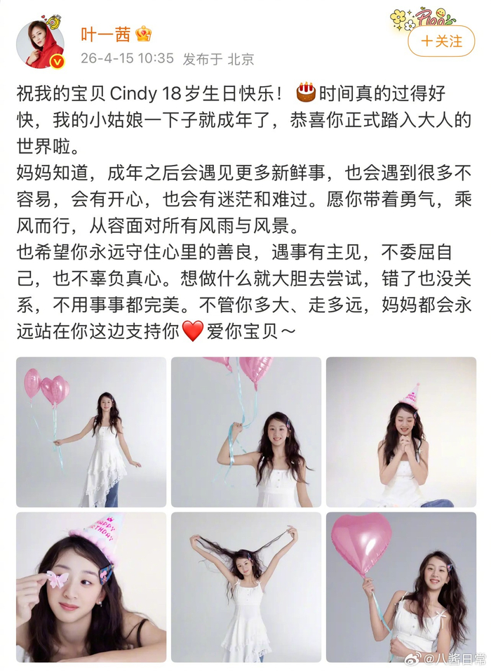 田亮、叶一茜女儿森碟18岁生日照