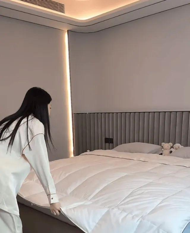 除了客厅,宣云还分享了夫妻俩的卧室。这一空间的设计更为简约大气,以灰色调为主,既有现代感,又不失温馨。床铺看起来又大又舒适,白色鹅绒被更是格外抢眼。有网友在评论中透露,单是这床上的鹅绒被,价格就超过了七千元。虽然卧室以灰色为主色调,但每一处细节都透露着温暖与精致。