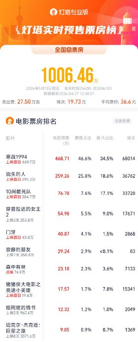 截至4月27日12时30分,2026年五一档首日(5月1日)预售票房正式突破1000万元,创下近年同档期首日预售新高。此次档期共集结18部新片,较2025年同期的10部增长近一倍,被业内称为“史上最拥挤五一档”。头部影片表现抢眼:港产警匪片《寒战1994》以166万元预售票房、超45%的占比断层领先;悬疑片《消失的人》与温情喜剧《10间敢死队》分列二、三位,三部影片共同贡献超六成预售份额。