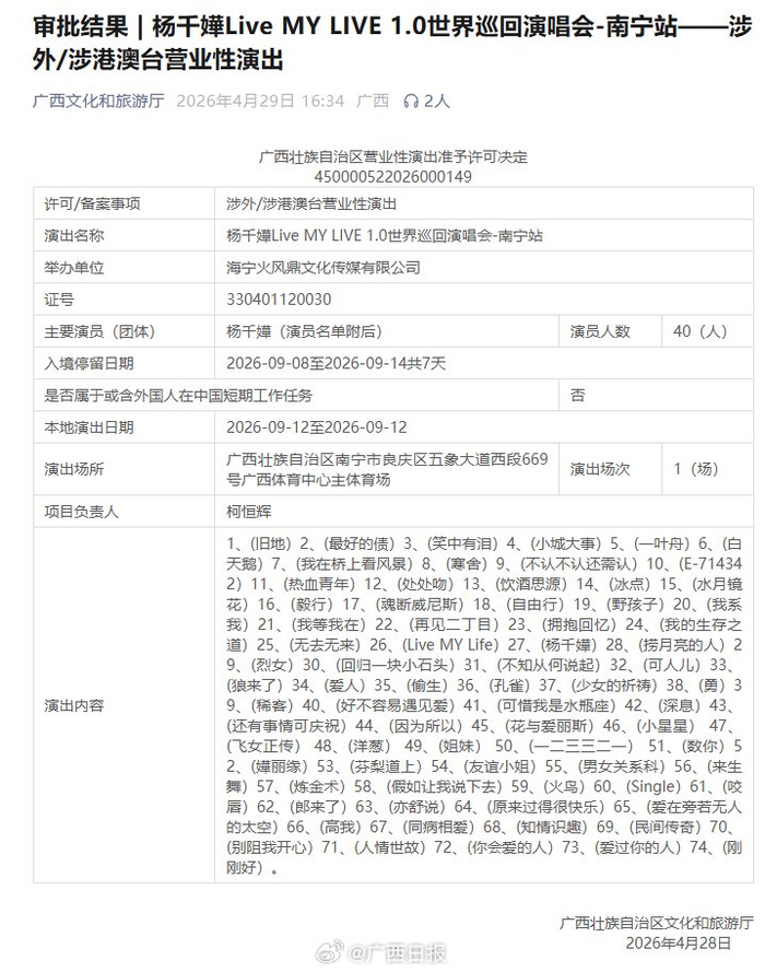 【审批通过!#杨千嬅又要来南宁开演唱会了#】4月29日,@楊千嬅 Live MY LIVE 1.0世界巡回演唱会南宁站官宣过审,广西歌迷幸福拉满🎉好期待,这次杨千嬅要把红磡拉到南宁啦!!小调查,你最想在演唱会现场听到哪首歌?评论区聊聊~ #杨千嬅[超话]# #J人老了捡纸壳也要震撼P人#