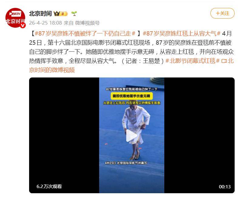 1. **网友A**:吴彦姝这辈子都没见过被绊倒后的优雅,简直是“老人党”发源地! ,2. **网友B**:红毯上的她,仿佛一首动人的“岁月如歌”,让人忘记了她有87岁。 ,3. **网友C**:这才是真正的高级感,不是靠打针和滤镜,而是从骨子里透出来的从容! ,4. **网友D**:她笑起来的样子,像是“皱纹是时光馈赠”的女王! ,5. **网友E**:这位奶奶,居然比我穿得还漂亮,白嫖娃! ,6. **网友F**:她红毯上的表现,简直像是经典时尚,一直都很酷。 ,7. **网友G**:她的银发和笑容,像一首动人的老歌,让人感动哭泪。 ,8. **网友H**:这位大姐妹,活得比我好多年轻人都通透,真的让人羡慕! ,9. **网友I**:她这辈子真的没遇到过什么“绊”,简直就是仙女的化身! ,10. **网友J**:她从容的表现,瞬间治愈了我对老年人的所有偏见。