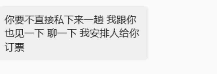 紧接着,洋三刀又晒出更为详尽的聊天记录。张开朗在聊天中真诚相邀:“你要不直接私下来一趟,我跟你也见一下聊一下,我安排人给你订票。”