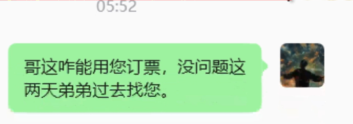 洋三刀恭敬地回复道:“哥,这咋能用您订票。没问题,这两天弟弟过去找您。”