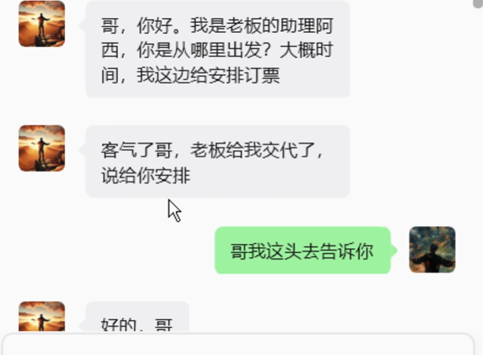 之后,洋三刀又晒出与张开朗助理的聊天记录。助理询问洋三刀:“哥,您从哪儿出发,计划何时动身,方便告知以便安排订票。”