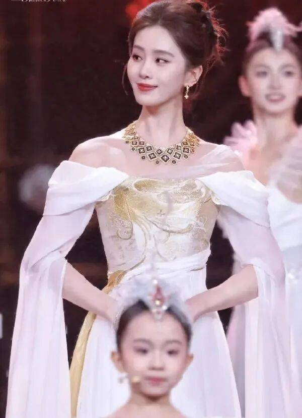 刘诗诗一身米白雪纺配鎏金刺绣往那儿一站,圣光普照四个字一点不夸张。