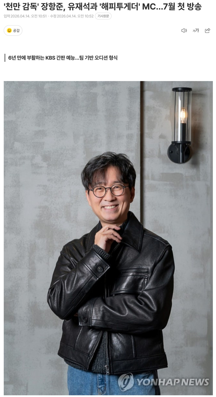 《与王生活的男人》“千万导演”张恒俊将担任时隔6年回归的KBS老牌综艺《Happy Together》MC,与刘在锡共同主持节目,节目预计7月首播。