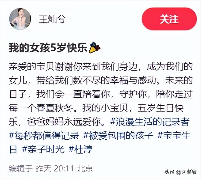 4月12日零点刚过,王灿就在短视频平台同步更新了为女儿小蛋饺庆生的视频与合照。