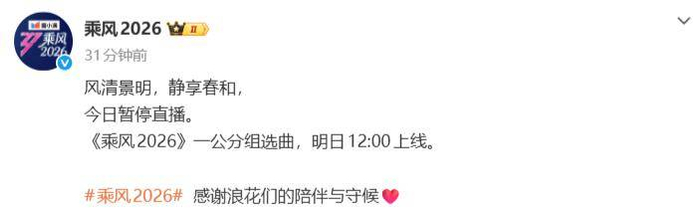 4月5日,《乘风2026》节目组发文宣布暂停原定今日举行的直播活动,将一公分组选曲内容改为4月6日12:00上线录播版本。
